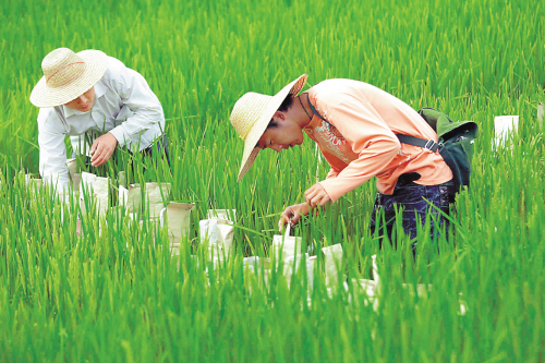 近日,在三亚荔枝沟师部农场南繁育种基地,来自河南信阳农科所的科研人员正在田间给杂交水稻的材料进行包裹,以保持材料花粉的纯性。每年9月份至次年5月份,全国各地的农作物种子工作者,利用三亚典型的热带气候条件,来到这里进行农作物种子繁殖、制种、加代、鉴定等科研生产活动。 本报记者 张杰 摄