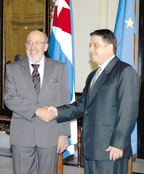3月8日,在古巴首都哈瓦那,古巴外长费利佩·佩雷斯(右)和欧盟负责发展和人道援助的委员米歇尔握手。米歇尔6日开始对古巴进行为期4天的访问,这次访问为古欧关系的恢复创造了新契机。2003年,因古巴对75名持不同政见者判处徒刑,欧盟对古巴开始采取制裁措施,从而使双边关系陷入了困境。 新华社发