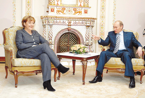 3月8日,俄罗斯总统普京(右)与来访的德国总理默克尔在莫斯科郊外举行会晤。普京8日会见默克尔后说,俄罗斯有可能同意科索沃独立,但前提是有关做法必须符合国际法。 新华社/路透