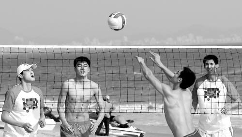 今天下午,国家男篮在三亚湾的沙滩上进行了一场别开生面的队内沙排赛。在松软的沙滩上跑跳比木地板的难度大多了。队友发过来一个球,刘晓宇高高跃起准备扣球,但他脚下一滑,没有扣到球。刘晓宇“滑稽”的动作也引得大家一片欢笑。“二传手”丁锦辉看到排球即将落地,于是他立即双拳紧握飞身救球,可惜球还是出界了。因为是调整性训练,男队员都玩得非常轻松,“大哥”李楠边发球边给大家传授排球规则。“内敛”的陈江华是发球高手,半天没上场,一上场直接一个发球得分。