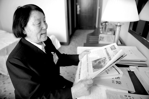 | 这是2008年3月7日,全国人大代表申纪兰在驻地阅读关于两会的报道。 |