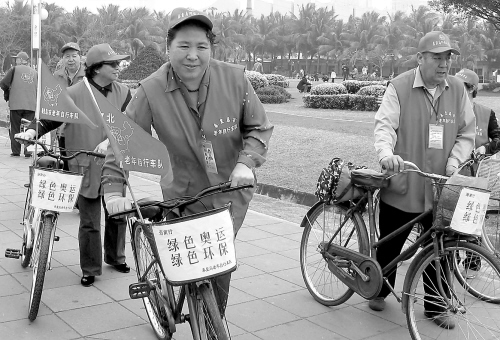 3月9日,来自河北秦皇岛市的十多位老人正在万绿园里骑车游玩。他们都是该市老年自行车队的会员。一位年过六旬的老人说,他们是昨天刚乘火车到达海口,今天集体买了十几辆旧车,计划用二十多天的时间环游海南岛,宣传绿色环保,喜迎北京奥运。 本报记者 王凯 通讯员 王道清 摄