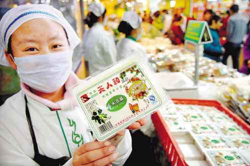 3月9日,银川新华百货连锁超市工作人员在介绍定型包装的豆腐。 2008年1月以来,银川市全面实施豆制品定型包装销售,除现场制售加工点外,严禁所有豆制品批发、零售业户销售裸装豆制品确保市民吃上安全放心的豆制品。 新华社发