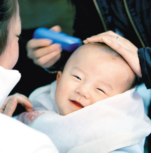 3月9日,一名小宝宝在安徽淮北一家婴幼儿服务店内理发。当日是农历二月初二“龙抬头”, 民间有“剃龙头”的说法,理发店的生意十分红火。 新华社发(王文 摄)