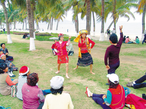 | 3月8日,三亚渔村100多名妇女相聚在三亚湾、大东海等景区,载歌载舞庆贺自己的节日。 三亚晨报 孙清 摄 |