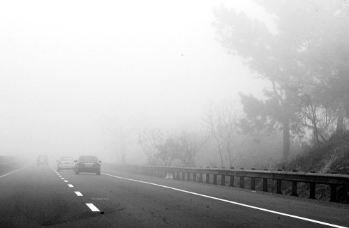3月10日上午9点19分,东线高速公路海口至定安段上,大雾笼罩,宛如仙境,由于能见度较低,汽车驾驶员都小心翼翼地开车。 本报记者 张杰 摄