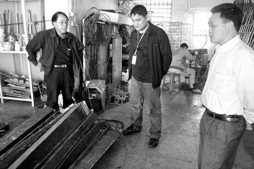 本报今天第十二版社会新闻中,披露了海口市琼山区红城湖路67号十几户居民,被隔壁一家铁艺加工点噪音、粉尘扰的不得安宁一事。该报道引起了海口市环境资源监察支队琼山大队领导高度重视。当天下午,大队长温锡贵就带领执法人员赶到这家铁艺加工点现场检查(见下图,古月摄)。