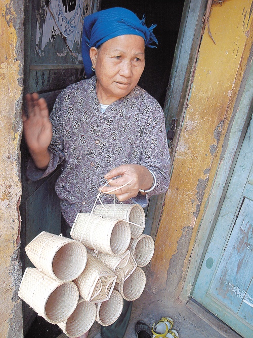 | 五指山市冲山镇太平村李玉英阿婆编的女子腰篓,做工精细,一个能卖10美元。 |