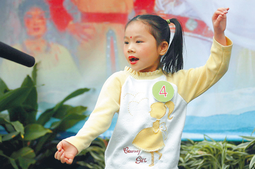 上午9时许开始初赛,热情的观众已将现场围得水泄不通。前三位热心参赛的大哥大妈遭评委淘汰。第四位选手是一位稚气未脱的小姑娘(右图),虽然年仅7岁,但经验丰富,面对众多观众毫无惧色,随着伴奏边唱边演,一招一式颇有表演才能,博得观众热烈喝彩。演唱还未完毕,评委为节约时间便叫停,第一个发给她“晋级卡”。