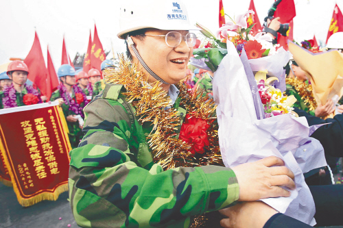 | 三月十日下午,海南电网赴黔抢险的最后一批队员在圆满完成各项任务后返琼,在海口港码头受到热烈欢迎。 本报记者 王凯 摄 |