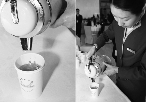 3月10日,人民大会堂的工作人员在为参加会议的客人准备饮用水。为尽量减少浪费,倒水量的默认值是七成满,如客人需要更多,再根据情况加满或者续杯。