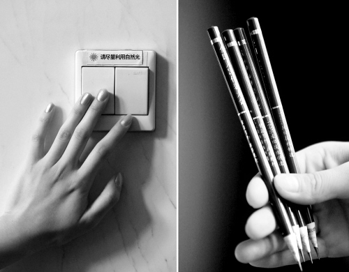 ② 人民大会堂内一处照明灯开关旁贴着“请尽量利用自然光”的提示,类似的提示随处可见。