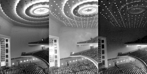 人民大会堂活动场所空间大,举行大型活动时,工作人员根据现场客人入场情况按阶梯式开启照明灯,待客人大批入场时再打开全部照明灯,此举可以节约大量照明用电。这组拼版照片显示的是3月10日,十一届全国人大一次会议第三次全体会议时人民大会堂内的照明情况。