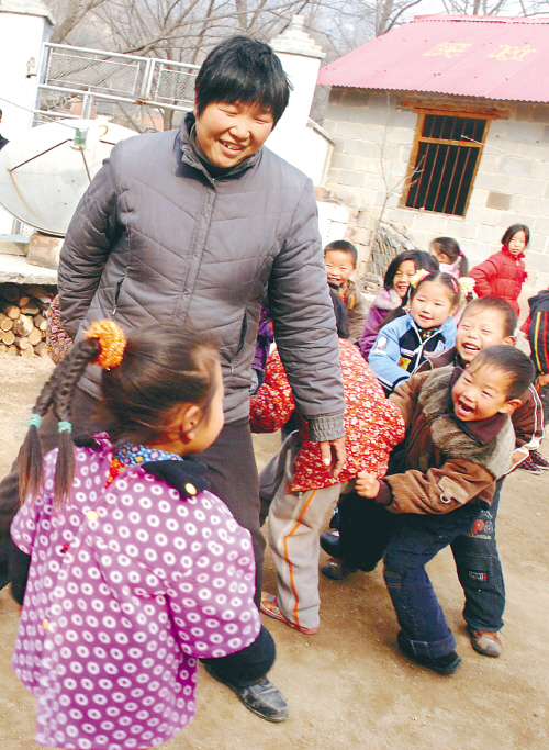 | 上图:妻子李正洁利用空闲时间和孩子们做游戏(2007年12月20日摄)。