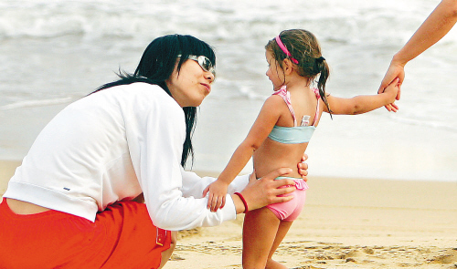 | ↑国家女篮中锋陈楠在沙滩上和一位可爱的俄罗斯小游客玩耍。 |