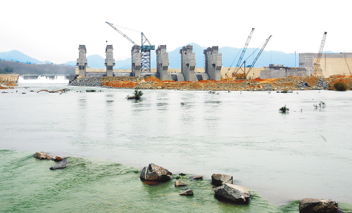 ←3月12日,东方市戈枕村华能海南发电股份有限公司戈枕水利枢纽工程正在加紧施工。该工程于2007年2月26日开工,工程总投资约10亿元。截至目前整个工程已经完成50%以上,完成投资3.08亿元。预计到2009年9月份第一台机组可发电。 据悉,大广坝水利水电二期(灌区)工程戈枕枢纽位于东方和昌江境内,是海南岛第二大河流昌化江干流三个梯级规划电站的最下游一个梯级,也是大广坝灌区工程的配水枢纽。戈枕枢纽总库容1.46亿立方米,装机总容量为80兆瓦。 本报记者 王凯 张中宝 摄影报道