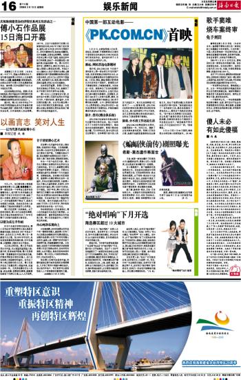 3月12日,由新锐导演小江执导,房祖名、陈柏霖、牛萌萌等联合主演的中国首部互动电影《PK.COM.CN》在京举行首映发布会,宣布该片将于3月14日起在全国同步上映。 源起:网民票选电影题材 据介绍,《PK.COM.CN》不仅是中国电影史上第一部全英文片名的国产电影,还是首部通过网络评选方式,由网民选出最喜爱剧本并拍摄而成的电影。3年前,博客、播客(视频分享)等表达方式还未在中国流行,普通观众并不掌握话语权,只能被动接受。为改变这一状况,新浪举办了互动电影题材票选,将决定权交给观众,让他们选出自己感兴趣的电影题材。这场甄选,共吸引360多万人次参与投票,最终,网络小说《谁说青春不能错》以100多万票的绝对高票,从与《梦里花落知多少》、《晃晃悠悠》、《毕业那天我们一起失恋》等竞争中脱颖而出,并被改编拍摄成电影《PK.COM.CN》。 影片:借用《搏击俱乐部》 《PK.COM.CN》讲述外科医生张文礼过着平淡乏味的生活,他心中始终忘不了大学时代的好友季银川,每当他对生活感到绝望时,季银川都会给他力量。可大学毕业后,张文礼再也没见过季银川,在和季银川昔日恋人吴羽飞的回忆中,张文礼发现季银川已经死了……从剧情来看,《PK.COM.CN》和好莱坞电影《搏击俱乐部》有相似之处。原小说作者何小平也不讳言,自己正是受到《搏击俱乐部》的启示,创作出了《谁说青春不能错》。 演戏:分不清工作还是生活 《PK.COM.CN》筹备期长达两年,拍摄周期近一年,时间之长,刷新了以往同类电影的纪录。导演小江告诉记者,她最开始就想邀请房祖名出演张文礼,却由于他要拍摄《太阳照常升起》而不得不放弃,“谁知道在经历了一系列波折之后,最后还是落在了房祖名头上,看来这个角色注定是他的。”戏中张文礼和季银川关系亲密,这让私底下就是好朋友的房祖名和陈柏霖,在演戏时甚至分不清是在工作还是在生活中,“感觉就是平常的生活,只不过说话方式不一样。”陈柏霖说。 3月14日至4月20日期间,海南观众也将在海口欣赏到该片。(柯 璐) |