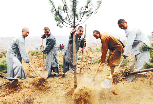 3月12日,少林寺的僧人也特意前来参加种植活动。 当天,共青团郑州市委在河南登封市嵩山脚下组织了“嵩山申遗有我一份”洛阳、安阳、郑州三地青年携手共植“和谐林”活动,1000余名青年人参加植树活动。 新华社记者 岳月伟 摄