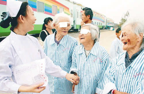 今天早上,健康快车上的医务人员为71岁的叶瑞花阿婆拆纱布检测眼睛时,她大声地说:“我看到了,那些字都可以看得到!”她兴奋地对记者说着回家的计划:“他们叫我回去编草席,我也想去。老在家里坐着,闷得很。”