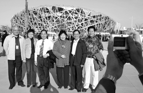 | 三月十三日下午,参加全国人大十一届一次会议的部分海南团代表和工作人员在国家体育场前合影。 本报特派记者 宋国强 摄 |