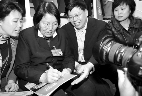 “活化石” 3月13日下午,被称为人大制度的“活化石”的全国人大代表申纪兰(左二)出现在奥运场馆时,立刻被“围”。签名、合影,79岁的申纪兰老人笑呵呵的满足了代表们的要求。申纪兰是山西省平顺县西沟村党总支副书记,是惟一一名连任十一届的全国人大代表。