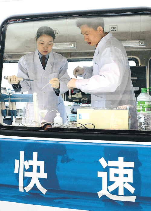 3月13日,在郑州街头一辆食品快速检测车内,工作人员在检测食盐的含碘量。 在“3·15”国际消费者权益日来临之际,河南省工商局组织了18辆食品快速检测车分赴全省各市、县,对当地的食品市场进行巡查检测,打击制售不合格食品的违法行为。 新华社记者王颂摄