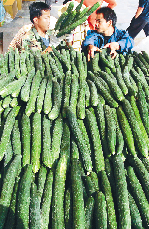 | 崖城镇农民在销售瓜菜。 本报记者 李英挺 摄 |