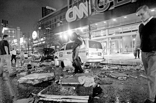 3月14日,在美国南部佐治亚州的亚特兰大市的美国有线电视新闻网(CNN)大楼外,一名男子背着他的女友走过暴风雨袭击后留下的残骸。当晚,一场强暴风雨袭击了亚特兰大市,造成不少房屋受损和一些市民受伤。 新华社/美联