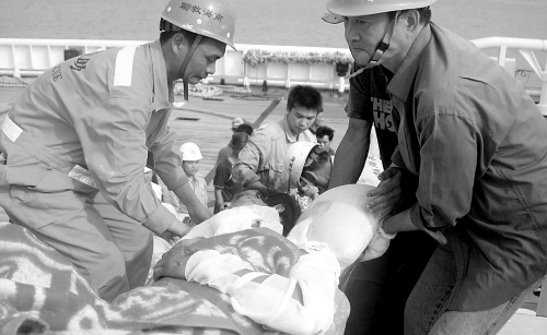 14日21时35分,“南海救111”轮在西沙北礁东北方向约60海里处与“DNA 66192”相遇,15名越南渔民登上“南海救111”轮。15日上午9时,15位获救渔民已经在南海救助局三亚基地码头安全登陆(见上图 本报记者李英挺摄),并通过三亚外事部门移交越南驻广州领事馆,但由于两名伤员伤情较严重,因此由外事部门委托三亚市人民医院进行紧急医治。