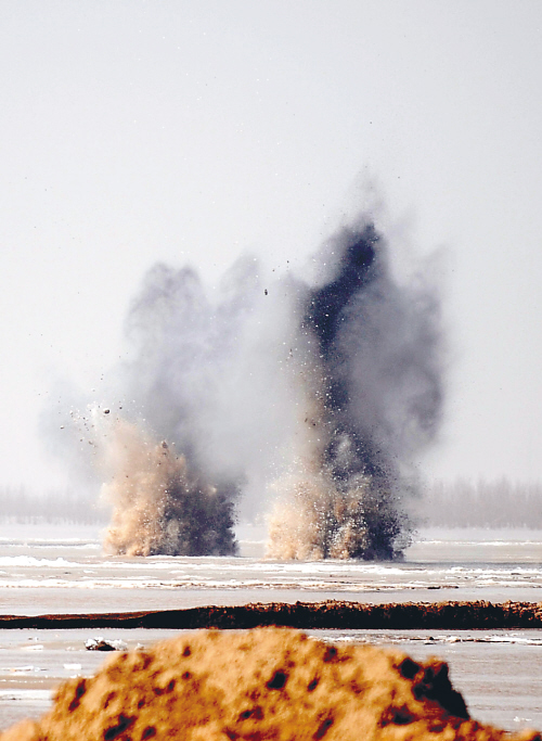 3月17日,北京军区某部炮兵在进行炮击破冰分凌。当日,北京军区某部炮兵连在内蒙古自治区黄河南岸达拉特旗黄牛营子河段进行炮击破冰分凌,成功破冰疏导流凌。这是黄河防凌历史上首次动用炮兵部队破冰除险。 新华社记者 任军川 摄