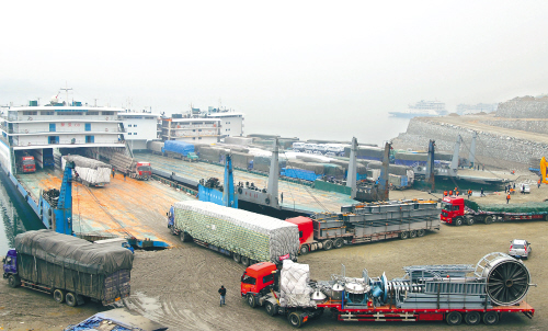 三峡船闸停运 三十七小时后复航 3月17日,三峡坝区水域雾情缓解后,秭归县银杏沱滚装码头恢复营运。长江三峡水利枢纽双线五级船闸在经过近37小时的持续停航后,于17日11时30分恢复双线通航,这是三峡船闸2003年6月建成通航后,因恶劣天气停运时间最长的一次。 新华社发(郑家裕 摄)