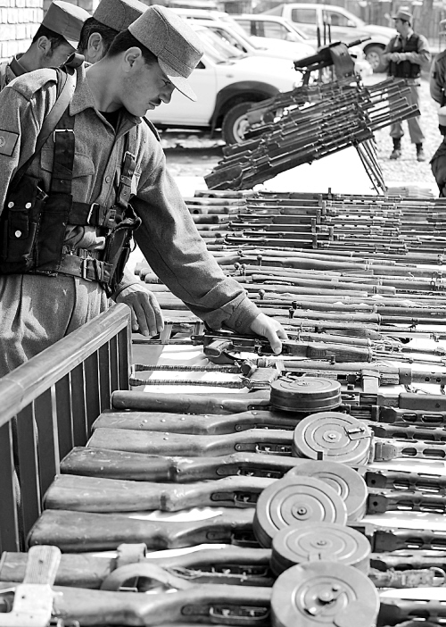3月17日,在阿富汗首都喀布尔以北80公里处的卡皮萨,阿富汗警察在武器移交仪式上检查枪支。当日,阿富汗部分非法武装组织在这里向政府移交了47种重、轻型武器。 新华社/法新