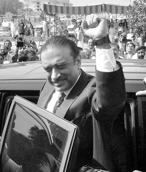 3月17日,在巴基斯坦首都伊斯兰堡,巴已故前总理贝·布托的丈夫、巴人民党联合主席扎尔达里抵达巴新一届国民议会(下院)首次会议的会场。巴基斯坦新一届国民议会(下院)首次会议于17日上午在伊斯兰堡举行,新当选议员在会上宣誓就职。 新华社/路透