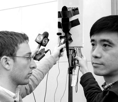 两会采访时,为取得较好的录音效果,一家媒体直接把麦克风粘贴在会场的扬声器上,而其他媒体的记者手持录音设备,凑近声源,长时间“岿然不动”。 新华社发