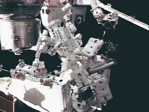 “奋进”号航天飞机宇航员进行第三次太空行走。 三月十七日,“奋进”号航天飞机上的两名宇航员在太空作业,对空间站机器人Dextre进行组装。 新华社/法新