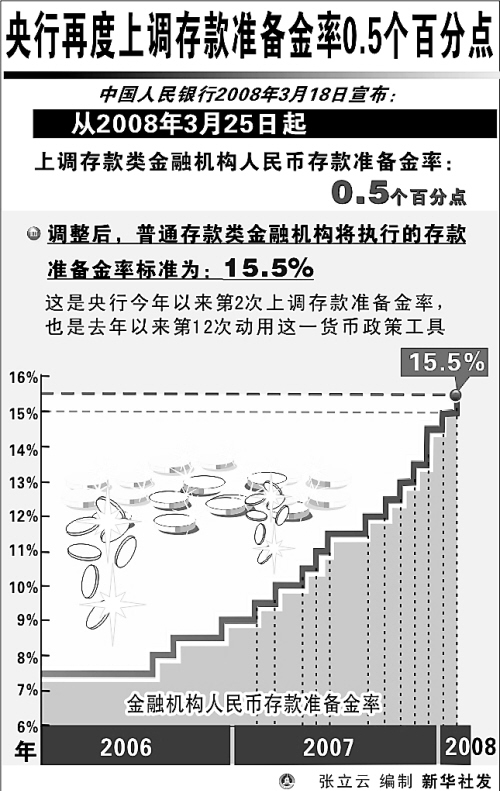 新华社北京3月18日电 (记者王文帅 王宇)中国人民银行18日宣布,从3月25日起上调存款类金融机构人民币存款准备金率0.5个百分点。这是央行今年以来第2次上调存款准备金率,也是去年以来第12次动用这一货币政策工具。