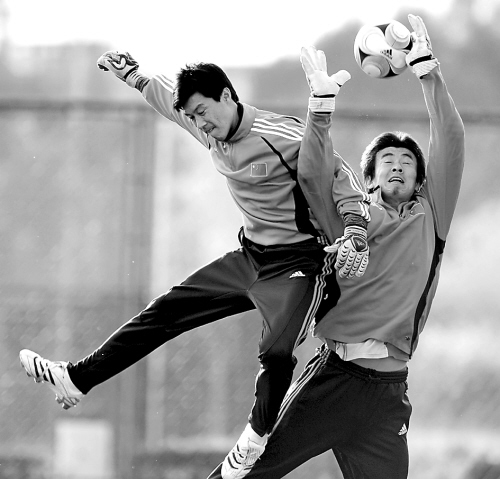 3月18日,国足结束假期,返回昆明投入训练,备战3月26日在昆明举行的与澳大利亚队的世界杯预选赛。图为国足守门员教练区楚良(左)在指导门将宋振瑜练习高空接球。 新华社发