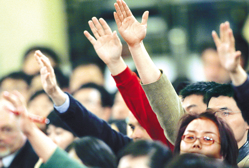 | 三月十八日,中外记者举手提问。