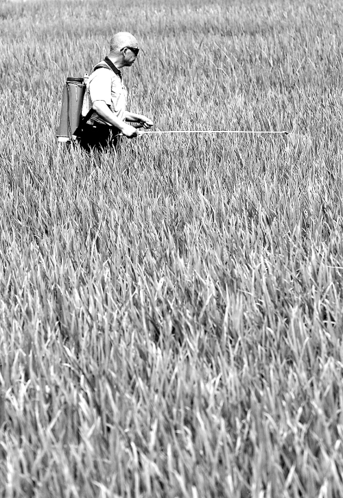 位于三亚南繁基地的国家杂交水稻工程技术研究中心海南基地,科研人员在两系超级杂交水稻高产示范田间施药。 本报记者 李英挺 摄