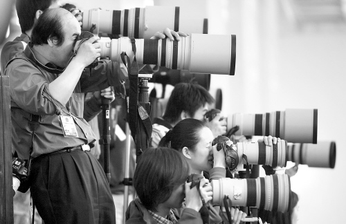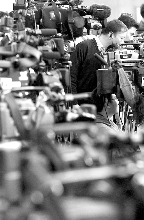 3月18日上午,十一届全国人大一次会议闭幕会后,国务院总理温家宝在人民大会堂与中外记者见面。图为中外媒体聚焦总理答记者问。 本报特派记者