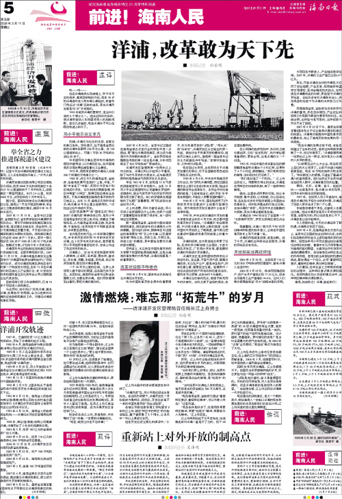 本报海口3月18日讯 (记者孙乐明)本报3月11日第五版“前进!海南人民”专栏,刊登了《洋浦,改革敢为天下先》和《激情燃烧:难忘那“拓荒牛”的岁月》等几篇文章,在读者中引起反响。
