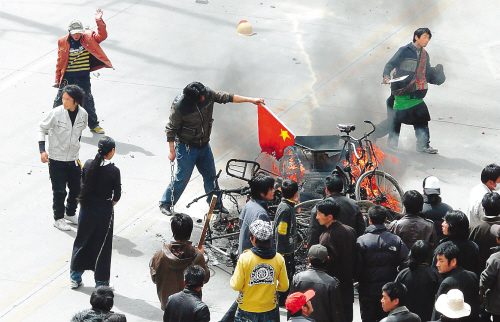 这张路透社播发的照片显示,三月十四日, 在西藏拉萨,一名右手持铁链的不法分子焚烧中国国旗,另一名不法分子手持砍刀。 新华社发