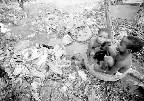 | 2006年5月22日,两名哥伦比亚小男孩在卡塔赫纳的一处污水沟中玩耍。
