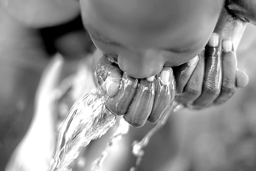 | 2007年10月19日,在乌干达的一个难民营里,一名女孩手捧着井水饮用。