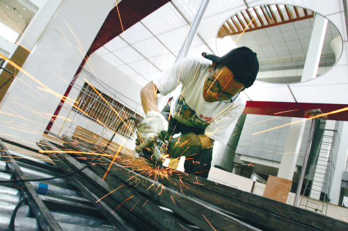 ←3月21日,在即将落成的省博物馆一楼大厅室内,工人们正在紧锣密鼓打磨角铁,进行搭架等施工,为4月初在此举行的建省办经济特区20周年成就展览而做准备。 本报记者 张杰 摄