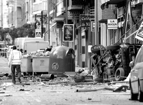 在西班牙北部城市卡拉奥拉,一名民防队员在炸弹爆炸事件现场查看