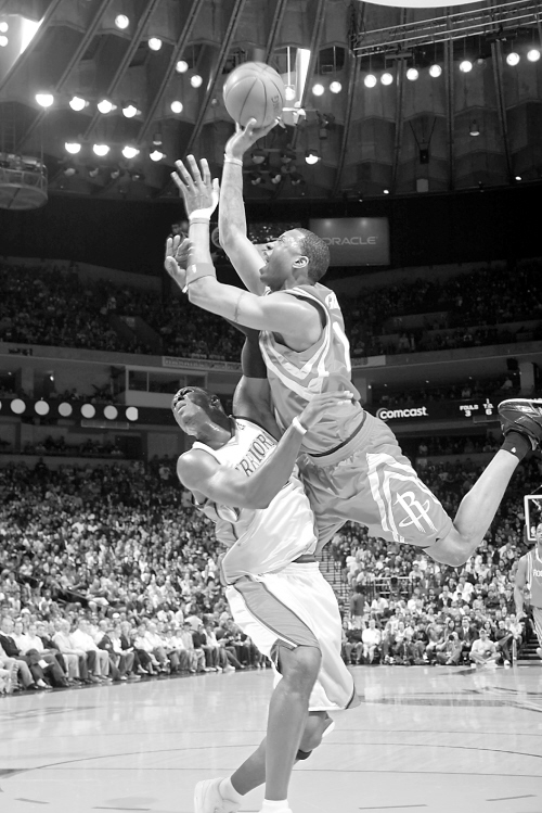 火箭队球员麦克格雷迪(右)在比赛中上篮
