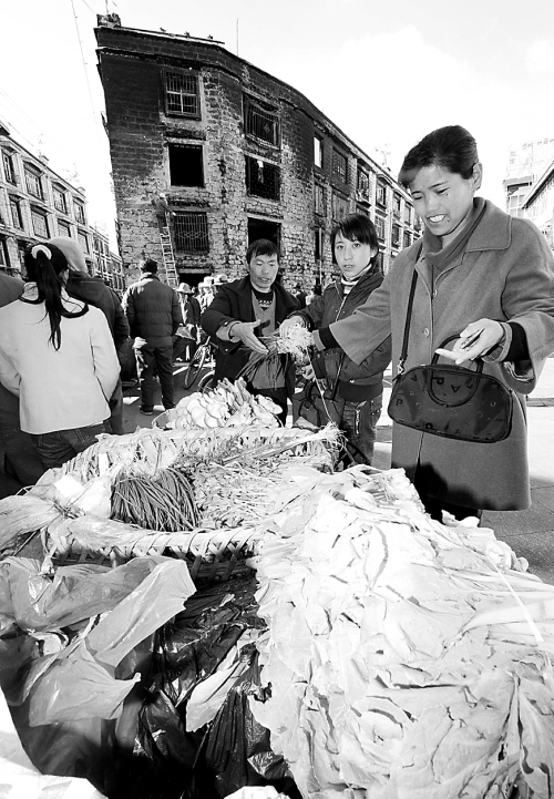 拉萨居民生活 逐步恢复正常 3月23日,居住在拉萨城关区措美林的居民潘多(右一)在冲赛康市场外买新鲜蔬菜。3月14日以来,首次有商贩在这里卖蔬菜。目前,拉萨“3·14”打砸抢烧事件受害最严重的城关区冲赛康、夏萨苏、吉崩岗等社区居民的生活正在逐步恢复,一些商铺重新开门营业,生活设施也逐步得到修复。 新华社记者格桑达瓦摄