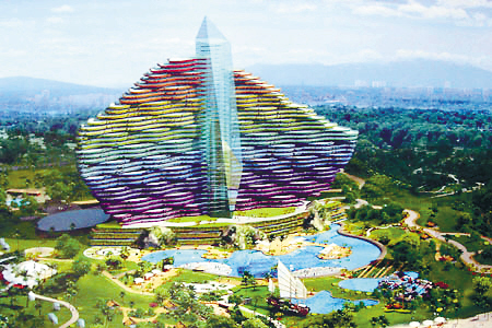 | ←海棠湾让人充满期待!今典集团七星级酒店和阿联酋迪拜的七星级帆船酒店的设计风格相似。图为该酒店效果图。