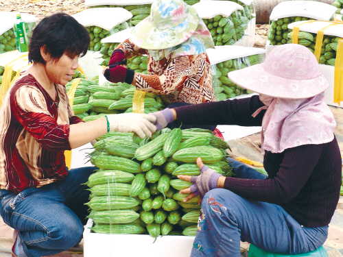 3月22日,三亚市海棠湾镇瓜菜市场热闹异常,农民们赶着早市把刚采摘的苦瓜送到市场出售,瓜菜收购站点赶着打包装往岛外发货。据了解,虽然春节过后,苦瓜的收购价格有所下降,但农民朋友们还是从苦瓜种植上尝到了甜头。 特约记者 孙清 摄影报道